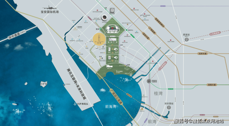 内湾由宝中、腾讯未来科技城(大铲湾)、妈湾、前湾、桂湾等片区环绕形成,为前海扩容后的核心组团,也是深圳西海岸上的湾区门户。