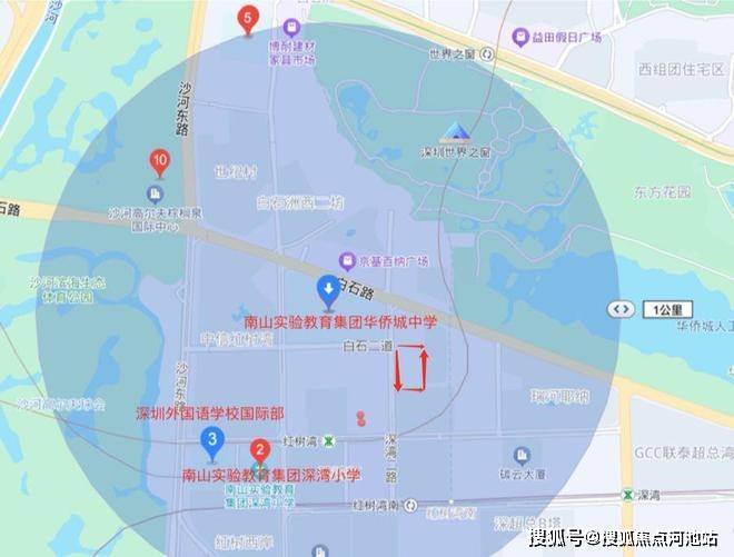 在生态与文娱资源方面,周边生态资源得天独厚;项目紧邻深超总中央绿轴,步行可达深圳湾公园、华侨城湿地公园,1.5公里范围内还有沙河湿地公园、世界之窗、华侨城欢乐海岸等休闲配套。
