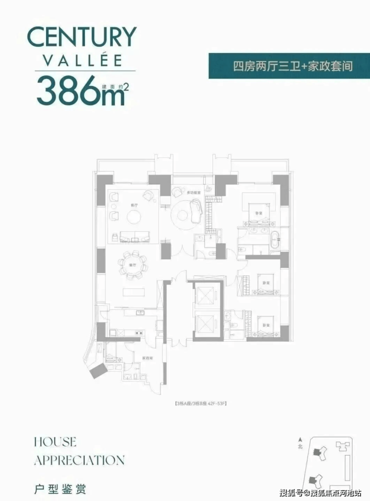 【约386㎡4+1房4卫】双梯入户,独立电梯厅,阔绰横厅直连多功能空间,三面舒适采光,主次卧双套房,270°环幕视野,还有独立家政套间,西朝向看名商高尔夫和大河沙生态长廊。
