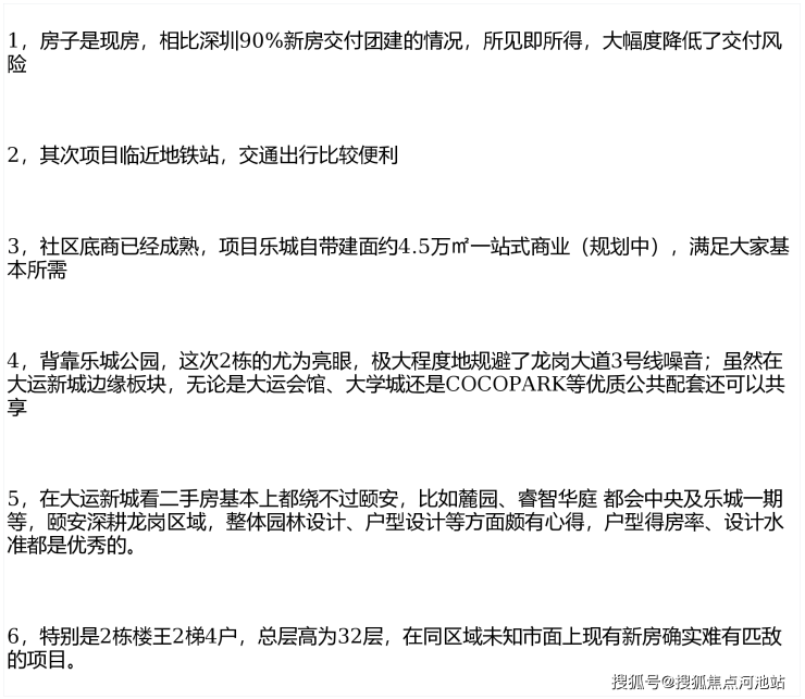 颐安乐城,总共分5期开发,大运是深圳的六大城市会客厅之一,是整个东部的中心,大运中心市政配套、交通便利、教育配套、商业设施在整个东部来说是最好,项目靠近大运体育馆,承接了深圳60%的赛事,包括世界杯预选赛,各大明星演唱会都选择在这里,有世界级的恒温游泳池,篮球馆,羽毛球馆等公共设施,包括华润万象天地商业。