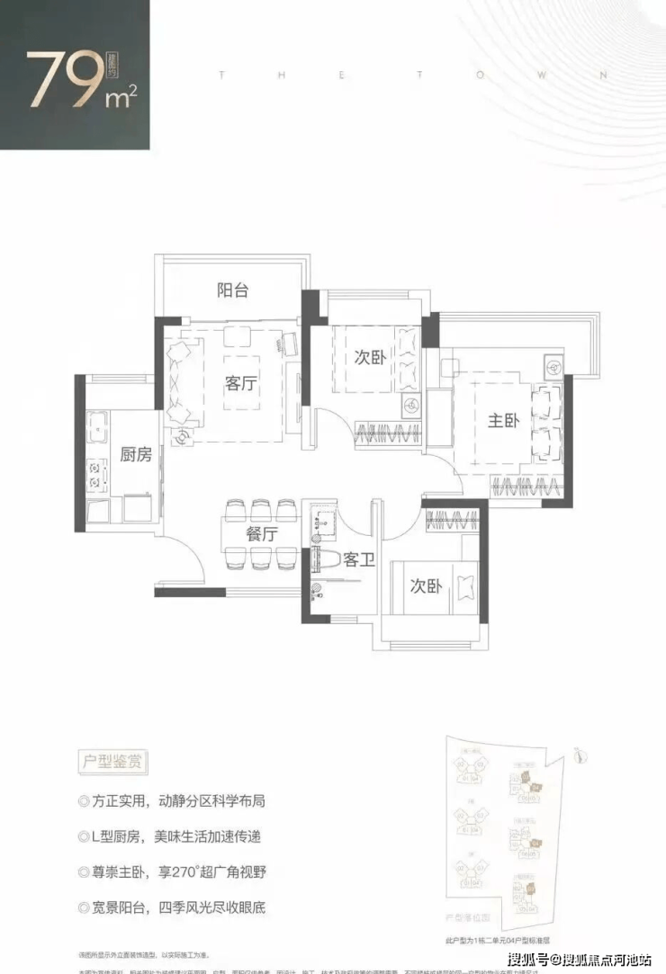 99㎡的4房2厅2卫,设计的是竖厅格局,客厅3.35米开间,LDKB一体化,S墙设计预留双开门冰箱卡槽位,三开间朝南,动静分区,U型厨房,公卫三段式干湿分离,赠送设备平台,得房率约78.27%(不含赠送),客厅连接次卧出9.37m²大阳台西南或东南朝向。靓点:99平做到了4房2卫,主卧270°无柱转角飘窗,厨房烟道外置+额外赠送设备平台,并且是纯南向格局。