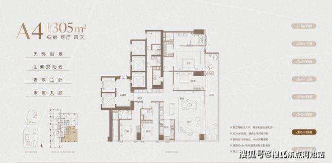 三大突出优势:空间和305㎡一样宽敞;全屋朝南,是多孩家庭的神器;总价比305㎡省数百万。