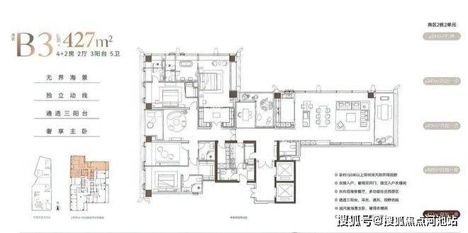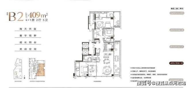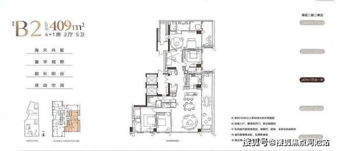 高区户型面积:350-409-430平。