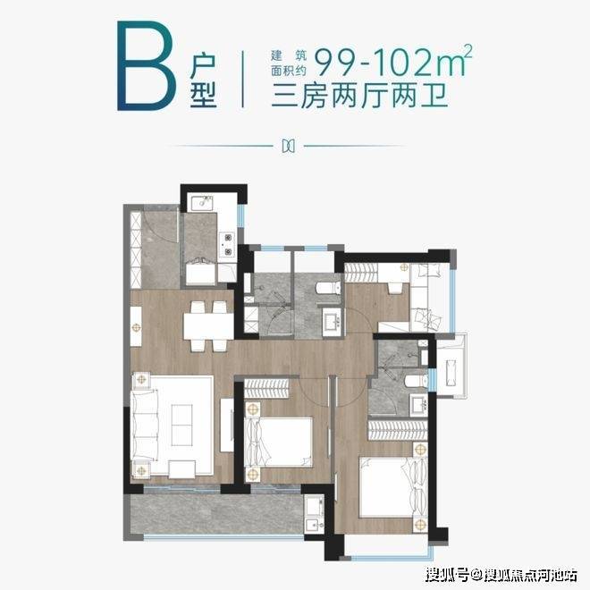 B户型:建面约99-102㎡三房两厅两卫,经典竖厅设计,全明格局,动静分区合理,约6.1米面宽景观大阳台,纵享绿色生态景观,全明超大主卧套间,私享卫浴及步入式衣帽间,科学布局8大收纳空间,空间使用率高,双次卧,满足三代同堂需求。