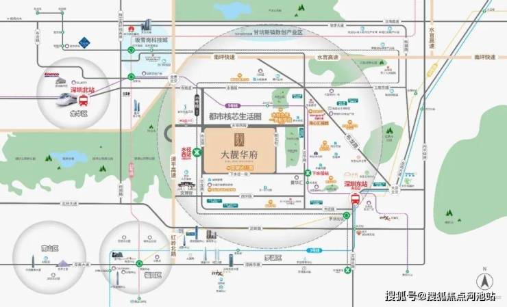 交通配套:大靓华府紧邻清平高速入口(500米),自驾30分钟可达福田;现有地铁5号线“下水径站”距离约1.5公里,需公交接驳;1公里内有10个公交站,覆盖5条地铁线(含3、14、10号线换乘),地铁25号线(规划中)设“水径西站”距项目仅200米,建成后可串联坂田科技城,但建设周期未定。
