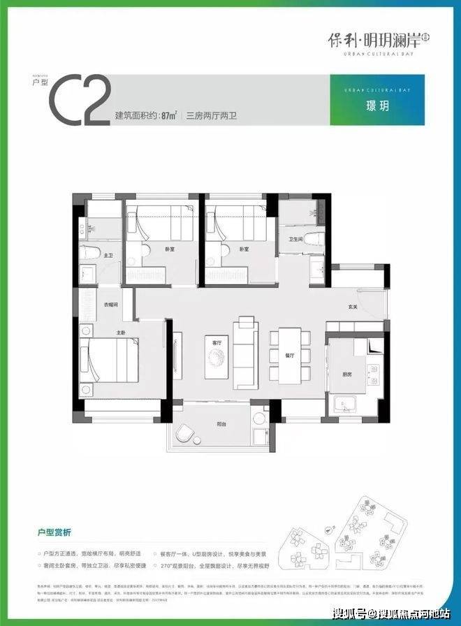 C2户型建面约87㎡三房两厅两卫