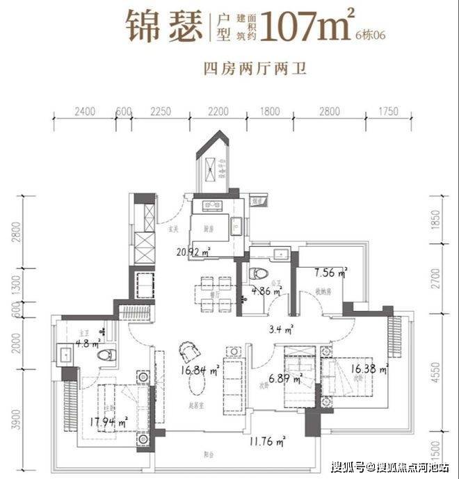 107㎡的4房2厅2卫,设计的是竖厅双龙抱珠格局,客厅3.7米开间,LDKB一体化设计,预留冰箱卡槽位,四开间朝南,主卧+2个次卧270°无柱转角飘窗,分别做到了主卧17.94㎡/次卧16.38㎡/次卧7.56㎡/次卧6.89㎡(包含墙体飘窗),U型厨房烟道外置,卫生间干湿分离,得房率约104.06%(包含赠送),客厅连接次卧出超大阳台约11.76平,东北朝向。