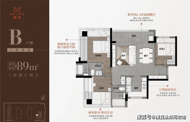 B户型西北向仅29套,大横厅户型,5.2的客厅开间,双龙抱珠户型,使用率98%