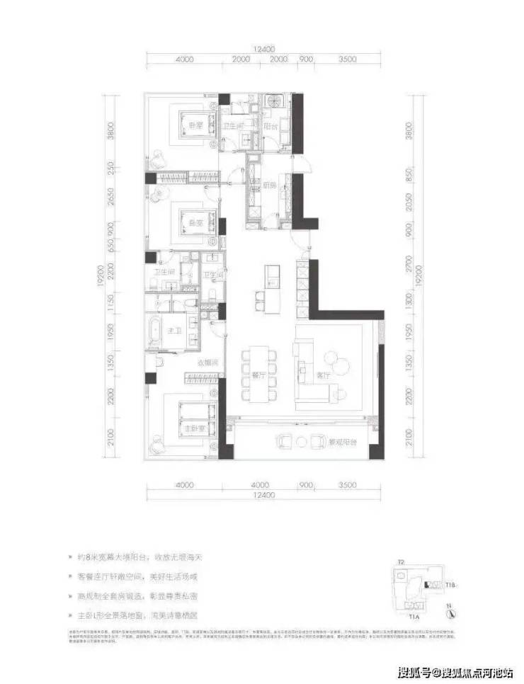 户型四套间设计,配备工人房,主佣分区,竖厅布局,约12m双厅进深,空间利用率很高。东端头位置,所有卧室都有开阔的景观,270°景观完全无遮挡。只存在T1B栋33-38层,仅6套。