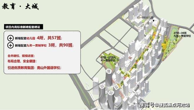 项目所处片区已纳入南山外国语集团教学,现在周边有沙河小学,南山第二实验学校,且项目共建设了4所幼儿园共57班,3所九年一贯制学校共90班。并且学校都将在一期建成时共同交付。进一步提升周边教育资源水平,实现一站式箐英教育。