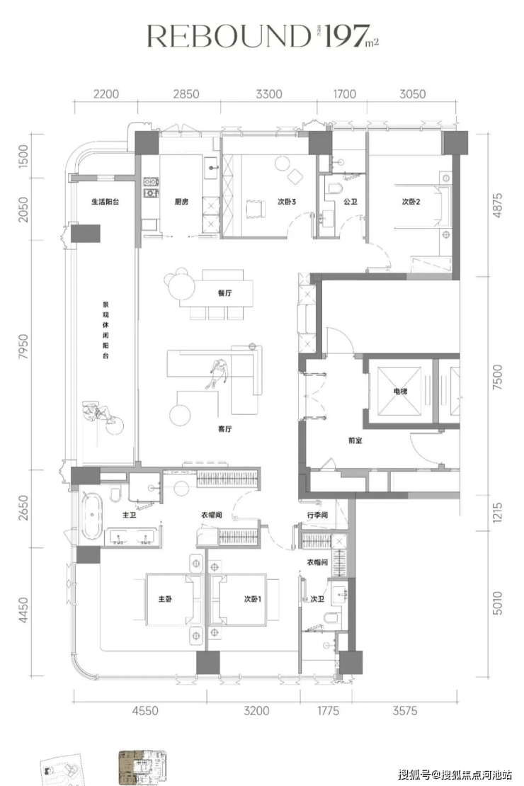 建面约197㎡户型,含电梯厅综合赠送后使用率可达93-95%。