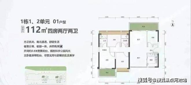 112㎡的4房2厅2卫,1栋1/2单元01户型,设计的是竖厅南北通透格局,进门入户玄关,客厅3.6米开间,餐客分离,餐厨一体设计,四开间朝南,主卧套房带阳台,客厅连接次卧出5.8米长的巨幕大阳台,U型厨房,卫生间干湿分离,阳台主朝东北向看科学公园。