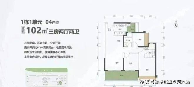 102㎡的3房2厅2卫,1栋1单元02户型,设计的是经典竖厅格局,进门入户玄关,客厅3.5米开间,LDKB一体化设计,三开间朝南,动静分区,客厅连接次卧出6.3米长的巨幕大阳台,二字型厨房还带1个生活阳台,卫生间干湿分离,西南朝向。
