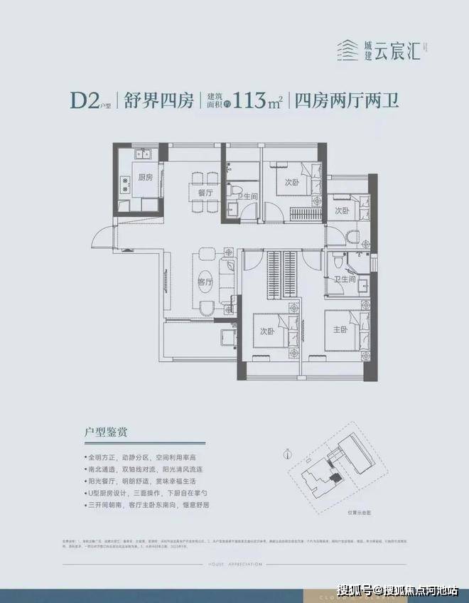 113㎡的4房2厅2卫,设计的竖厅南北通透格局,餐客厅一体化,U型厨房,阳台东