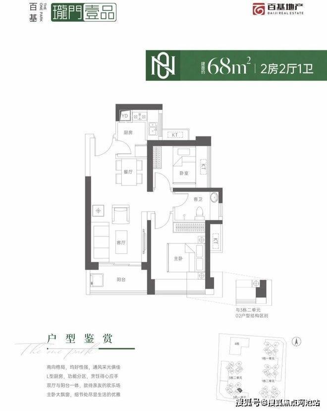 仅3栋1单元02户型,设计的是竖厅格局,客厅3.4米开间,LDKB一体化设计,L型厨房,卫生间干湿分离,东南朝向。