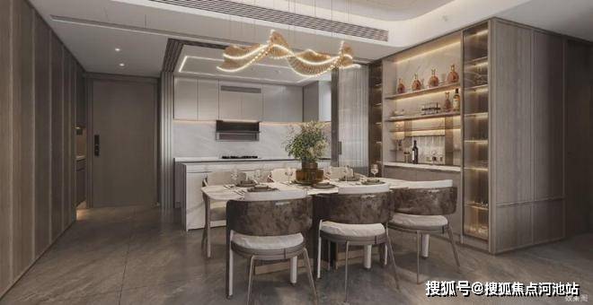 一体等宽的餐客厅,实用面积约55㎡,尺度感比较震撼,不输一些200㎡的豪宅,足够开个小型宴会了。开放式设计打通空间界限,高效动线串联烹饪、用餐、休闲、会客等场景。
