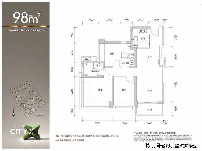 竖厅格局,客厅3.4米开间,三开间朝南,3个卧室分别做到了主卧14.3㎡/次卧10.36㎡/次卧6.75㎡(含飘窗),公卫三段式分离,得房率约90%(含赠送),东南或西南朝向。