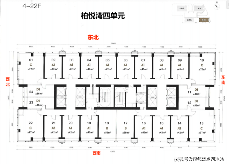 77㎡4房1卫一层4套端头位置东北,西北,东南西南,双面采光景观4面景观