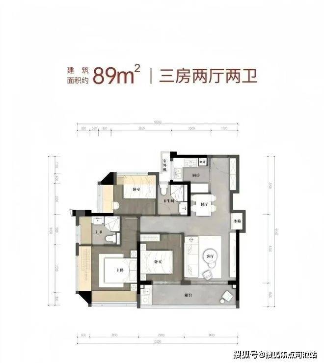 89m²的3房2厅2卫,折后总价335-375万/套,单价3.8-4.28万/m²。