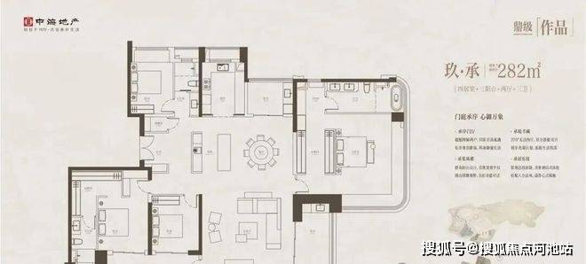 282㎡4房3卫:独立电梯入户,超大南北通一体化客餐厅,三阳台设计,顶级270°景观主卧套房,南向超长全景采光面,户型通透大气。