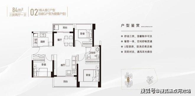 84㎡的3房2厅1卫,1栋A座C户型/1栋B座G户型,设计的是竖厅南北通透格局,客厅3.4米开间,客餐厅双阳台分离化设计,U型厨房,卫生间干湿分离,得房率约79%(不含赠送),客厅阳台主朝东北向。