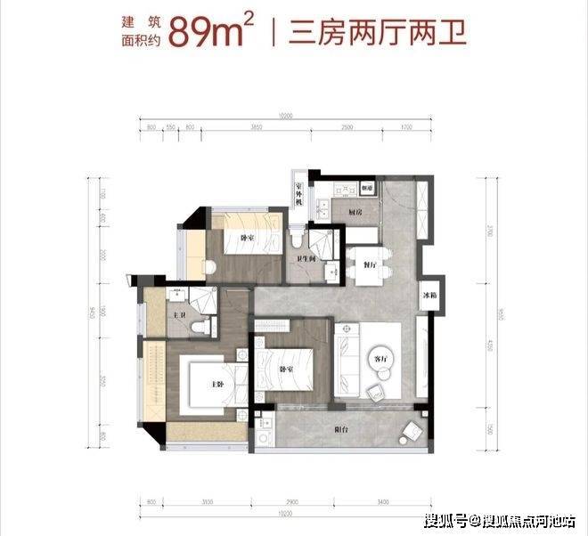 建筑面积约89㎡户型-3房2卫(横厅)