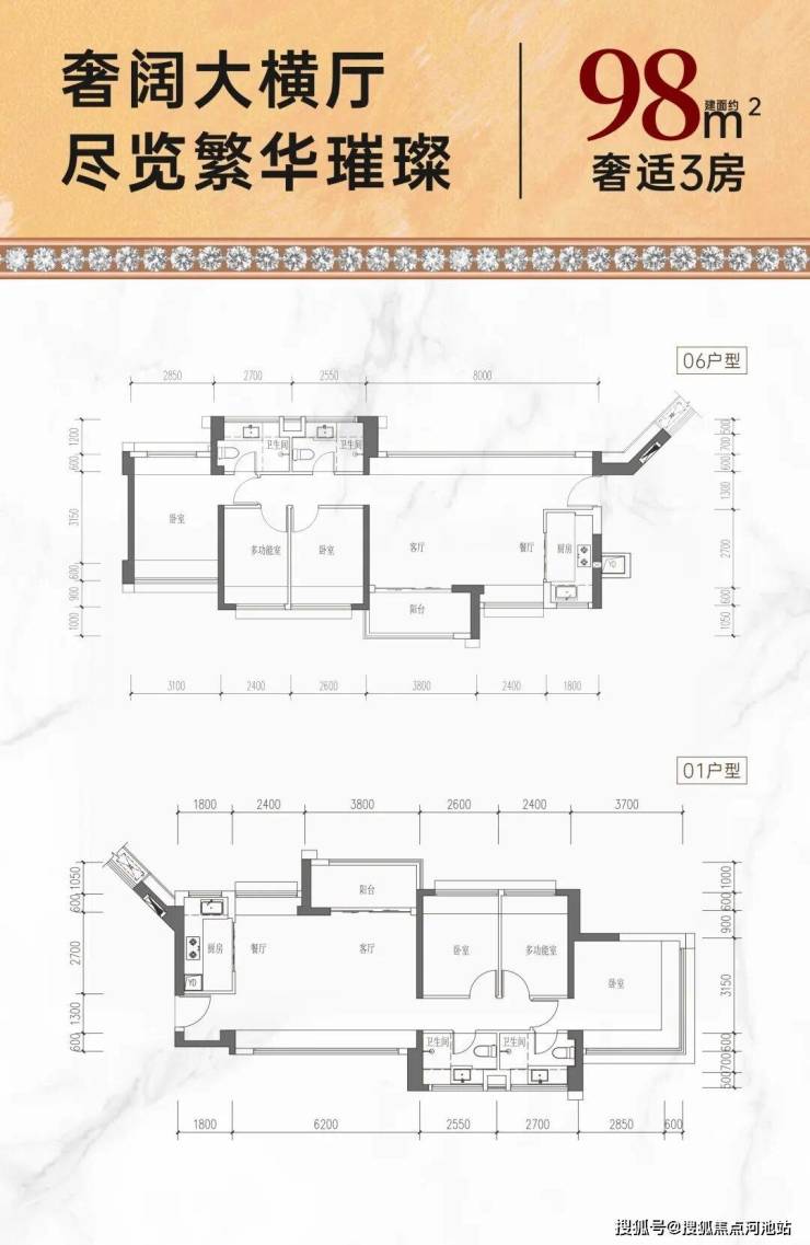 98㎡的3房2厅2卫,折后总价447-476万/套,单价4.55-4.85万/㎡。