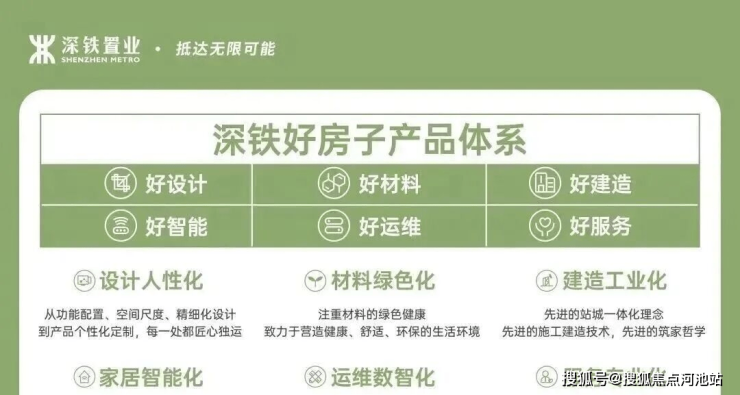 深铁置业”深入贯彻落实全国住房城乡建设工作会议精神,以精工细作“好房子”为使命,全力推动好设计、好材料、好建造、好智能、好运维、好服务的“六好”建设,以设计人性化、材料绿色化、建造工业化、家居智能化、运维数智化、服务专业化为特点,严格把控各个环节和指标。集团依托企业优势和群众需求,匠心构建了“好房子”企业标准体系,在该体系的引领下,不断超越行业标准,打造具有世界视野,蕴含中国文化,具备湾区特色,饱含深铁情怀的“好房子”。