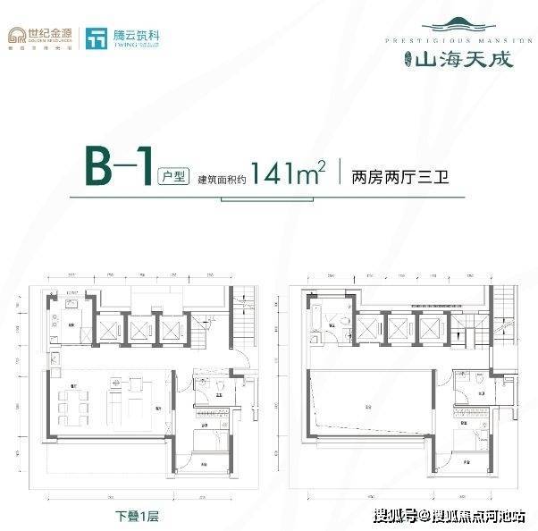 141-151㎡的复式洋房,上下2层,一层2户设计,客餐厅6.95米开间,中空客厅6米挑高,U型厨房,得房率86.17%(不含赠送),空间可塑性比较强。
