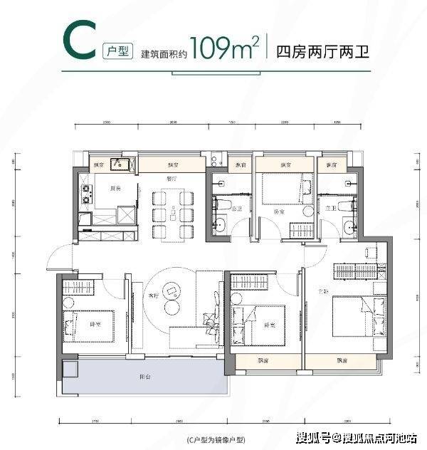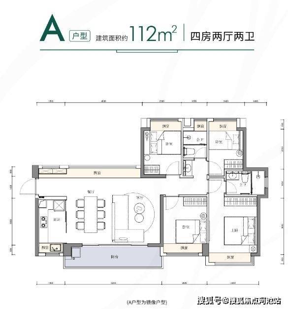 112㎡的4房2厅2卫,设计的是横厅南北通透格局,客餐厅6.2米开间,三开间朝南,4个卧室分别是3.3米/2.9米/2.5/2.4米的宽度,全屋飘窗,U型厨房,公卫三段式分离设计,得房率:80.14%(不含赠送),6.2米长的超大阳台,朝正南或西南朝向,看花园景观。