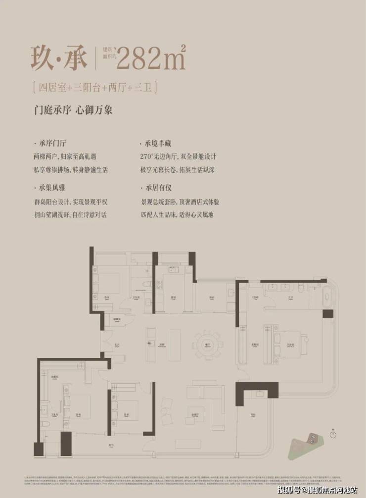 282m²的4房2厅3卫3阳台,设计的是竖厅格局,客厅6.2米开间,LDKB大方厅设计,2梯2户,尊享专梯专户,私享超大入户公区,五开间朝南,主卧270°无柱转角飘窗,双套房设计均配置衣帽间,中西双厨房,主卫配置浴缸,得房率约90.6%(包含赠送),不含电梯入户,南北双阳台,小阳台看大运公园山景,大阳台东南朝向,俯瞰整个大运中心。