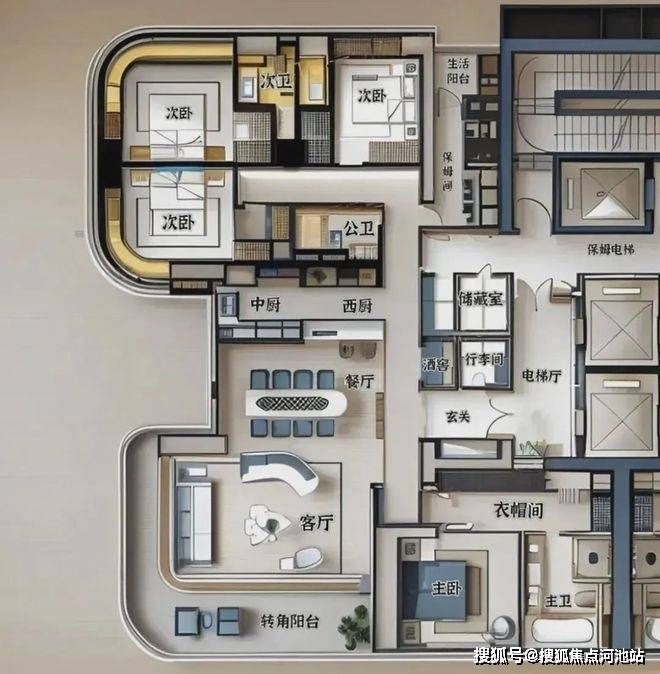 -510㎡一层一户顶豪:3梯1户的专属配置,层高3.6米,5+1房3厅5卫的阔绰格局,搭配165.77米的地标高度(43层),将"私密性"与"仪式感"拉至顶点。这种"一户独占整层"的设计,不仅是空间的奢侈,更是圈层纯粹性的象征。