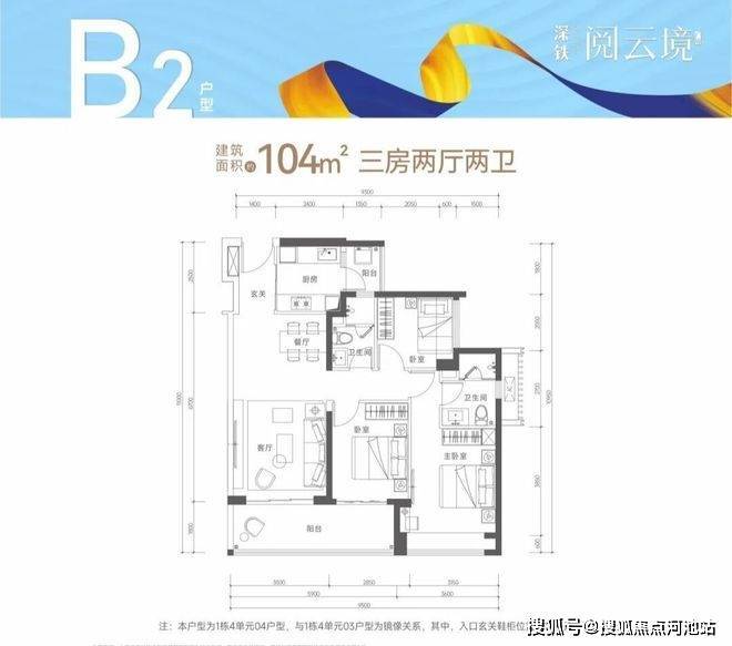 104㎡的3房2厅2卫,B2-1栋4单元03.04户型,设计的是经典竖厅格局,进门入户玄关,客厅3.5米开间,LDKB一体化,S墙设计预留冰箱卡槽位,三开间朝南,动静分区,3个卧室分别做到了主卧16.1㎡/次卧9.12/次卧6.89㎡(包含墙体飘窗),二字型厨房带1个2.43㎡大的生活阳台,卫生间干湿分离,得房率79.2%(不含赠送),客厅连接次卧出11.43㎡大阳台,正南朝向。套内面积82.37㎡+赠送面积10.14㎡=实际使用面积92.51㎡,加上赠送后得房率约88.95%。