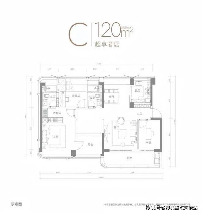 120㎡的4房2厅2卫,南北通透设计,玄关入户,客厅3.585米宽,餐客厅独立,四室朝南(主卧17.83m²/次卧11.16m²/次卧8.84m²/次卧7.04m²),U型厨房,卫生间干湿分区,得房率75.91%,客厅连卧室6.2米阳台9.92m²,朝向西南或东南。