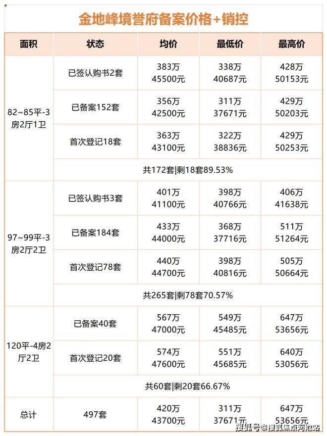 金地峰境誉府自2023年9月首次开盘入市,2年多时间销售390多套,去化率79%,剩下约100套。目前特价优惠,均价3.87万/m²,单价3.48-4.26万/m²。3房总价289万起,4房总价482万起。