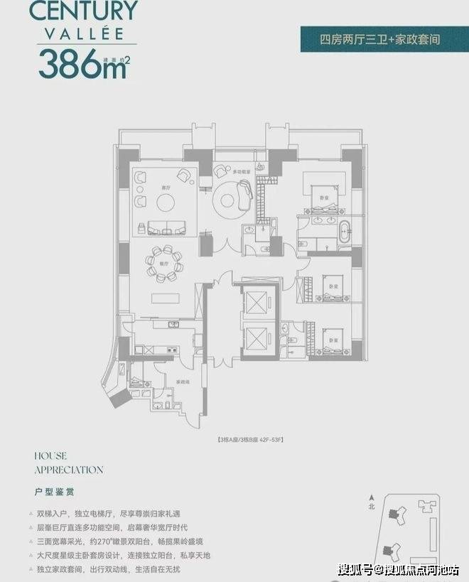 【约386㎡4+1房4卫】双梯入户,独立电梯厅,阔绰横厅直连多功能空间,三面舒适采光,主次卧双套房,270°环幕视野,还有独立家政套间,西朝向看名商高尔夫和大河沙生态长廊。
