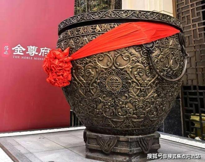 比如,小区大门口福地之上摆放的两尊聚宝盆,重达1.5吨,纯铜定制的镇宅之宝,刻画着五福捧寿图样,寓意上好。