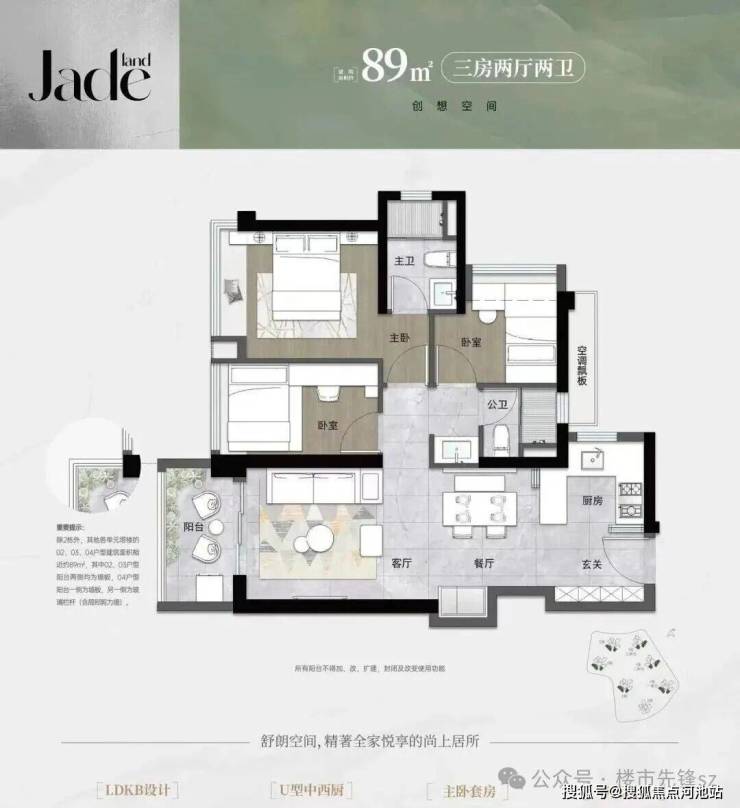 建面89平米:3房2厅2卫,传统的竖厅动静分区格局;S墙设计预留冰箱位,U型厨房,卫生间三段式分离设计,可以理解成80平米户型的加强版;这个面积段是项目的主力户型,有东南和西南两个朝向;整个户型设计没有特别大的亮眼之处