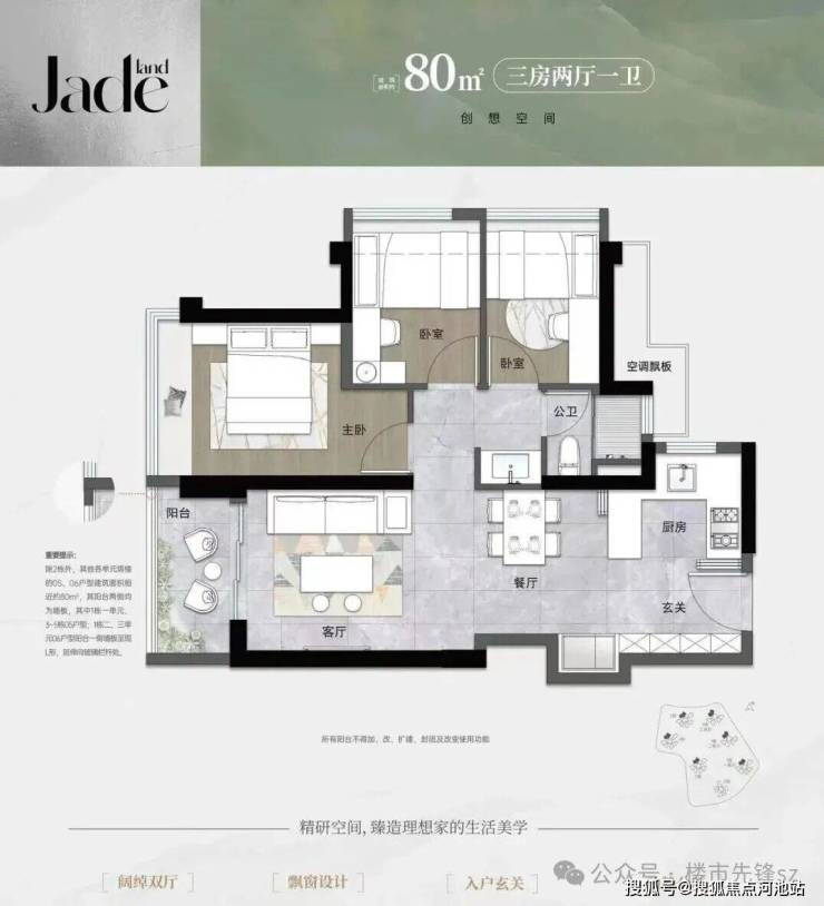 建面80平米:3房2厅1卫,传统的竖厅动静分区格局;S墙设计预留冰箱位,U型厨房,卫生间三段式分离设计,符合当下户型设计的主流;承重墙没有凸起,所有的房间飘窗很好利用;紧凑的刚需三房,功能齐全