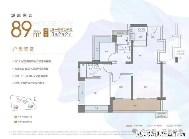 东南或西南朝向,竖厅设计,客厅有预留冰箱位,客厅,主卧,次卧分别朝南,户型一共有8个飘窗,加上阳台和飘窗使用率在90%左右。