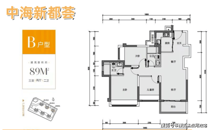 89㎡的3房2厅2卫,设计的是竖厅格局,客厅3.3米开间,S墙体设计预留双开门冰箱位,动静分区,三开间朝南,L型厨房,3个卧室的宽度分别为3.5/2.7/2.5米,得房率87.96-89.68%(包含赠送),阳台进深1.5米,朝西南或东南向。