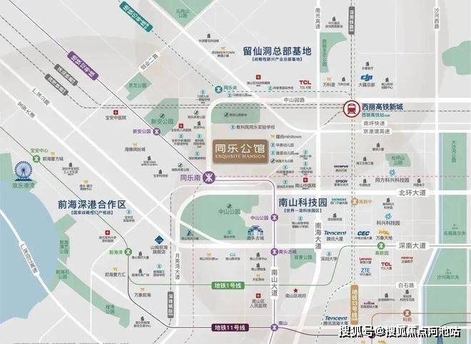 看下图,同乐公馆东面是南山科技园,西面是前海,南面是后海、深圳湾,北面是西丽留仙洞。