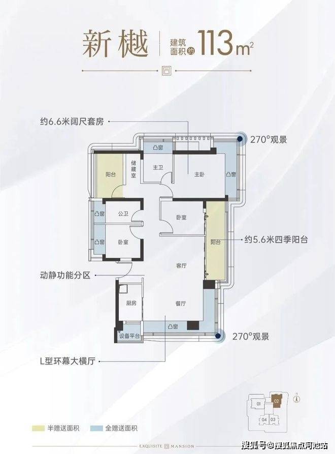 同乐公馆目前91-113㎡户型已经出炉,123㎡户型暂未公布,其中113㎡户型是个亮点,客厅房间基本都是270°转角飘窗采光,使用率高达94%。