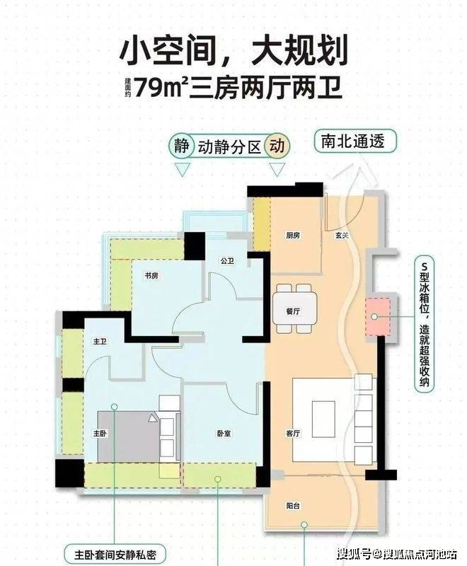 79㎡的3房2厅2卫,设计的是经典竖厅格局,客厅3.3米开间,LDKB一体化,S墙设计预留冰箱卡槽位,动静分区,三开间朝南,3个卧室分别做到了主卧12.1㎡/次卧7.36㎡/次卧6.67㎡(包含墙体飘窗),主卧+1个次卧270°飘窗设计,U型厨房,公卫三段式分离,得房率约88%(包含赠送),东南或西南朝向。