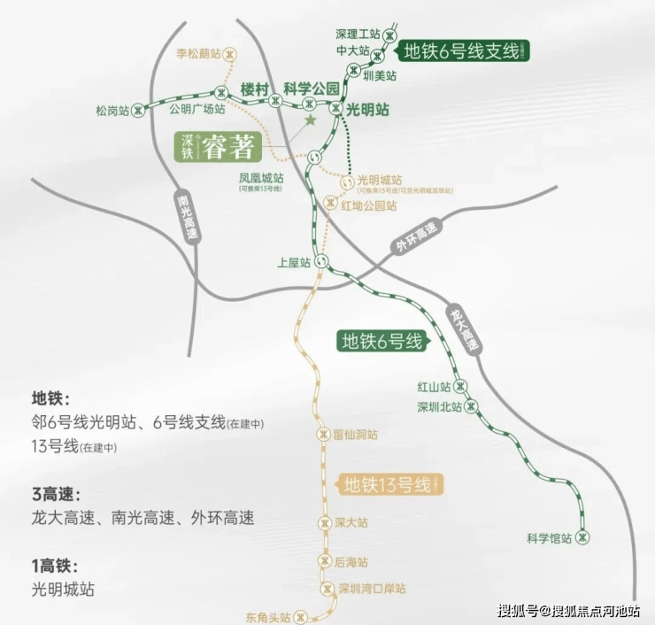 ★项目周边有6号地铁线3站点环绕,包括光明站(距离约1公里)、科学公园站(直线距离800米)和楼村站(距离约1.2公里)。其中,光明站可换乘6号支线,快速通达其他区域。