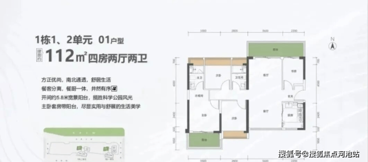 112㎡的4房2厅2卫,1栋1/2单元01户型,设计的是竖厅南北通透格局,进门入户玄关,客厅3.6米开间,餐客分离,餐厨一体设计,四开间朝南,主卧套房带阳台,4个卧室分别做到了主卧18.43㎡/次卧10.5㎡/次卧9.12㎡/次卧7.26㎡(包含墙体飘窗),客厅连接次卧出9.28㎡的巨幕大阳台,U型厨房,卫生间干湿分离,得房率约:80%(不含赠送),阳台主朝东北向看科学公园。套内面积89.6㎡+赠送面积16.1㎡=实用面积105.7㎡,加上赠送后得房率约94.37%。