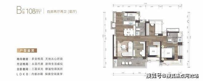 建筑面积约108㎡户型-4房2卫(竖厅)
