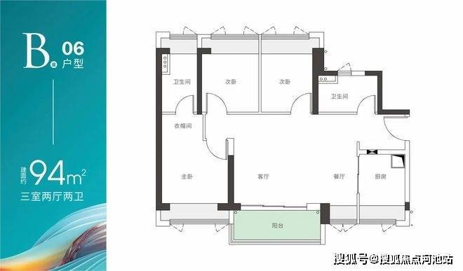 B座06户型-建面约94m² 三房两厅两卫