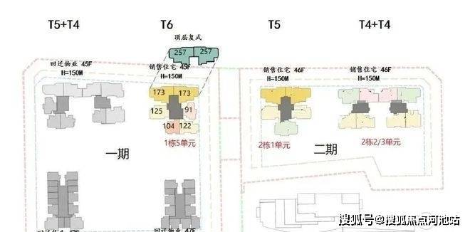 首推一期1栋5单元(45层),91-173㎡3-4房,共232套,以122-175平米4房为主,占比83%,还有两套257平顶复产品。173/257平大户型双电梯独立电梯厅入户,南区91-125平户型3梯4户。