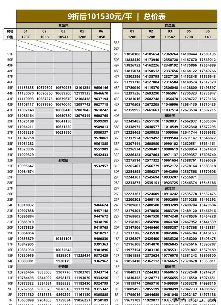 105户型:单价:8.56-11.74万/㎡,总价:894-1237万